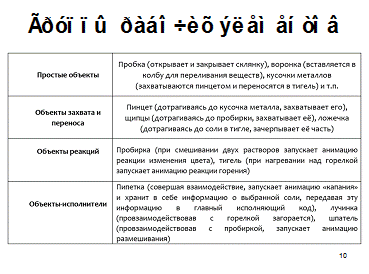 Каждая виртуальная лабораторная работа соответствует одному из блоков практикума по общей химии. Выполнение лабораторных работ предполагает взаимодействие с пользователем (нажатие управляющих кнопок, ввод текстовых данных и т.д.).