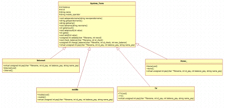 Данная диаграмма отражает основную суть курсового проекта - иерархию классов, реализующих в совокупности функционал терминала. Классом-предком в данном случае является класс System_Term. Этот класс является абстрактным и поэтому не может иметь экземпляров. От него отнаследован классы Internet, mobile, TV, Home.