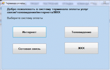 Этот подход можно также применить и системе терминалов олпаты различных услуг, таких как оплата услуг мобильной связи, оплата услуг жилищно-коммунального комплекса и т.д. В данном курсовом проекте мною был реализован терминал оплаты услуг связи, интернета, телевидения и ЖКХ. Данная система является достаточно сложно и требует максимально использовать возможности объектно-ориентированого программирования.