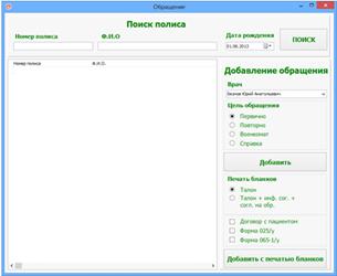 Нажатие на кнопку "Поиск обращений" активирует модуль в котором открыто окно поиска пациента по номеру полиса, Ф.И.О. и дате рождения. Поиск может производиться как по всем, так и по одному из критериев. Так как данный модуль находится первым в списке то его можно также увидеть в главном окне (см. рисунок 18).