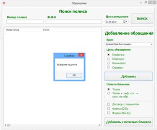 Далее выбрав необходимого человека нужно выбрать врача ведущего прием а также цель обращения. При нажатии на кнопку "Добавить", данные по обращению занесутся в общую базу хранящуюся на сервере.