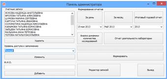 На данной форме пользователь может изменять список учетных записей, а также уровень доступа к заполнению каждого из пользователей. Также имеется возможность формирования отчетов и редактор записей, позволяющий редактировать ошибочные данные.