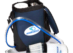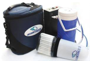 Данное устройство, продаваемое под торговой маркой CoreControlPro (рисунок 8а - составные части изделия; 8б - изделие в сборе), состоит из трех основных элементов: блока контроля температуры, охладителя, в который заливается хладагент, пластикового корпуса, куда помещается рука, и соединительного шланга длиной 0,9 м. В комплект также входят зарядное устройство и сумка для переноски.