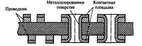 для обеспечения надежной защиты отверстий диаметр контактной площадки выполняют в 1,4 раза больше диаметра отверстия, а минимальный поясок контактной площадки b (ширина между краем контактной площадки и отверстием) - не менее 0,1 мм;