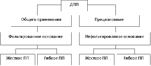 Различают ДПП общего применения и прецизионные, которые отличаются сложностью конструкции, разрешающей способностью и точностью элементов печатного рисунка, материалами, областью применения, стоимостью и другими характеристиками, причем те и другие изготавливают на фольгированном и нефольгированном жестком и гибком основании.
