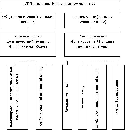 На рисунке 2.4 приведены методы изготовления ДПП общего применения и прецизионных ДПП на жестком фольгированном основании.