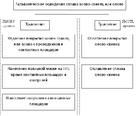 Печатные платы для поверхностного монтажа обычно изготавливают по SMOBS - процессу. Это связано с высокой плотностью монтажа, необходимостью предотвращения растекания маски и ее смещения на контактные площадки. Применение SMOBS - процесса связано также с жесткими экологическими ограничениями по свинцу, необходимостью очистки отработанной воды при применении свинца и затратами на приобретение соответствующего оборудования.