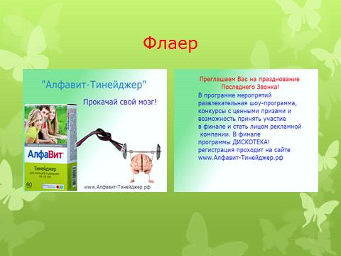 Для привлечения участников будет организована раздача фляеров и образцов продукции промоутерами у Вузов и во время проведения акций в школах.