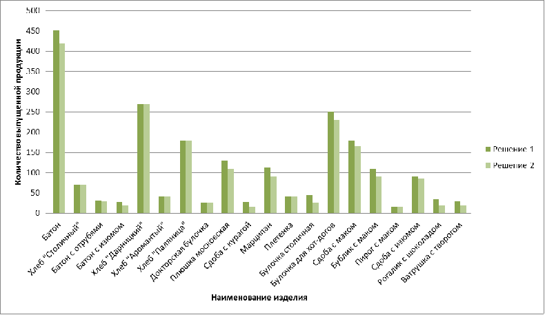 По данным таблицы 9 составляется диаграмма (Приложение 5), на которой наглядно видно, какой продукции выпущено больше, а какой меньше при разных интерпретациях задачи.