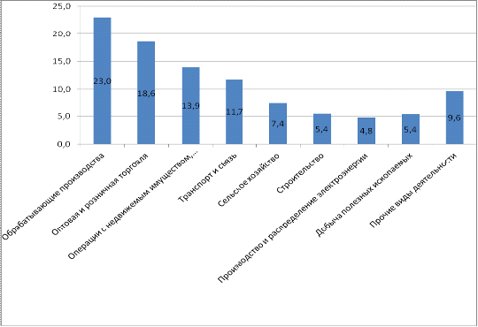 деятельности: обрабатывающие производства - 23%, второе место занимает Оптовая