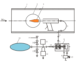 Перед началом эксперимента баллон 16 заполнялся воздухом из трассы высокого давления 15 (открывался клапан 14). Величина давления в баллоне определялась по образцовому манометру 11. При достижении нужного давления в баллоне клапан 14 закрывался. Избыточное давление стравливалось в атмосферу через клапан 13 при необходимости. Основной пневмоклапан 8 обеспечивал надежную работу системы подачи (исключал протечки) т.к. давление в трассе высокого давления 15 как минимум в 9 раз превышало давление в баллоне. Максимальное давление газа в системе составляло 150 бар.
