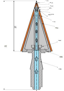 Осуществлена модернизация внутренней части конуса рис 3.1. Нарезана резьба на рёбра решётки 5, крепящуюся к носку модели, и на втулку-воздуховод 4. Резьба на этих поверхностях позволила регулировать высоту щели поворотом носка по азимуту. Модель позволяла поворачивать носок в любой из назначенных азимутальных углов. В программе Autodesk Inventor удалось рассчитать точную высоту щели, при повороте носка на 360º. При шаге резьбы 0.5, поворотом носка на 360º устанавливалась высота щели 0.18 мм в критическом сечении. При последующем повороте носка высота изменялась соответственно 0.36 мм, 0.72 мм.