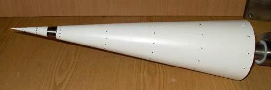 Данная модель конуса была изготовлена из теплоизоляционного материала АГ-4. Оказалось, что оптическая неоднородность материала АГ-4 при совмещении изображений существенно увеличивает шум получаемых полей температуры. К тому же, краска ЛПТ плохо смачивается с АГ-4 и при нанесении ее пульверизатором не удается получить тонкое покрытие. В ходе поисков материала для изготовления моделей, проводились измерения теплофизики различных материалов, и было обнаружено, что эпоксидная краска ЭП-140 с окисью титана в качестве пигмента, выпускающаяся в России, имеет теплофизику, близкую к материалу АГ-4. [1]
