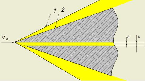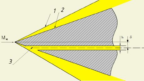 Она представляет из себя конус длиной 400 мм с углом полураскрытия 8○. Вдув газа осуществлялся через осе симметричную щель под углом 10○ и углом полураскрытия 3○ к образующей конуса. Передняя острая кромка щели находилась на расстоянии S = 72.7 мм вдоль образующей от носка модели длиною вдоль образующей L = 404 мм. Критическое сечение щели располагалось на радиусе rin = 6.5 мм от оси симметрии конуса, а высота щели в критическом сечении устанавливалась d*= 0.18, 0.36 и 0.72 мм. При одновременном изменении давления выдуваемого газа и высоты щели производилось варьирование скоростного напора на выходе из щели при постоянном расходе.