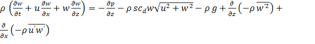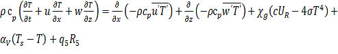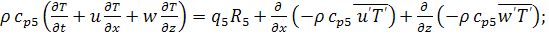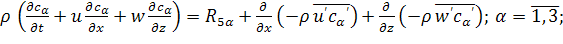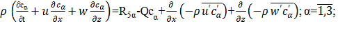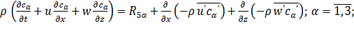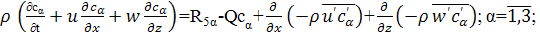 Система уравнений (1.1) - (11.5) является обобщением известной системы уравнений Рейнольдса для турбулентных течений однофазной инертной жидкости и в то же время представляет собой частный случай математической модели лесных пожаров, предложенной в [1]. Наличие последних двух слагаемый в уравнениях (1.2) - (1.5), (1.10) - (1.13) обусловлено турбулентным характером течения как в приземном слое, так и в пологе леса. Член сαQ в уравнениях сохранения индивидуальных компонентов (1.4) является следствием недивергентной формы уравнений и отражает факт разбавления газовой фазы продуктами пиролиза, испарения влаги и горения ЛГМ.