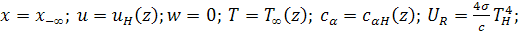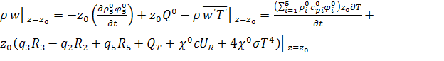 Взаимодействие процессов горения в нижних и верхних ярусах леса в данной модели учитывается через граничные условия (1.19). Поскольку процессы, протекающие при пожаре в верхнем и нижнем ярусах леса, аналогичны, последние описываются уравнениями, приведенными выше. Интегрируя эти уравнения по высоте нижнего яруса леса (z0), пользуясь соотношениями масштабов (z0<<h) и отбрасывая производные в направлении x, получим условия (1.19).