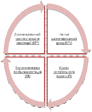 Оценка с помощью дисконтированных методов оценки более точна, так как учитываются различные виды инфляции, изменения процентной ставки, нормы доходности и т.д. К этим показателям относят метод индекса рентабельности (profitability index, PI), чистую приведенную стоимость, иначе называемую “чистый дисконтированный доход” (net present value, NPV), внутреннюю норму (ставку) доходности (internal rate of return, IRR), дисконтированный срок окупаемости (DPP).