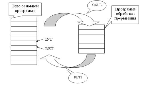 При поступлении запроса прерываний контроллер прерывания формирует в ЦПУ сигнал прерывания INT. После получения сигнала прерывания INT ЦПУ завершает выполнение текущей команды прерываемой программы и формирует сигнал подтверждения INTA. После получения INTA КП формирует команду вызова подпрограммы Call ADRi. Подпрограммы обработки прерывания обязательно завершаются командой RETI, в соответствии с которой в программный счетчик из стека загружается адрес ранее сохраненный командой CALL, сохраненной в стеке, для возврата в прерванную программу. Команда RET также возвращает управление прерванной программе, но не снимает при этом блокировку прерываний.