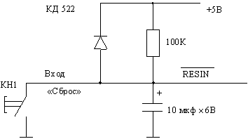 Формирователь сигнала сброса (рис.1.5) служит для начальной установки МПС при включении питания или при нажатии кнопки КН1. Время заряда конденсатора через резистор определяет длительность формируемого импульса. Диод служит для быстрой разрядки конденсатора при кратковременном отключении питания.