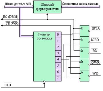 стробирующий слово состояния микропроцессора. Кроме того, в БИС размещены