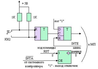 Для осуществления прерываний в МПМ могут использоваться различные аппаратные средства, в частности в схеме. Первый триггер служит для предотвращения "дребезга" контактов кнопки КН2, второй - для выдачи запроса на прерывание в микропроцессор. После поступления от микропроцессора подтверждения запроса на прерывание на шину данных микропроцессора подается код команды RST, соответствующей реализуемому уровню прерывания.