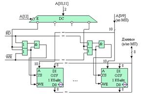 Разработка памяти МПС должна начинаться с определения ее емкости, требуемой для размещения программ (ПЗУ) и переменных (ОЗУ). Разрядность памяти соответствует разрядности микропроцессора и равна байту. Техническим заданием на курсовой проект определены конкретные типы ИС ОЗУ и ПЗУ. Если для реализации необходимого объема памяти оказывается недостаточно одной ИС ЗУ, потребуется модульная структура на основе нескольких банков памяти, выбираемых адресным дешифратором (рис.1.13).