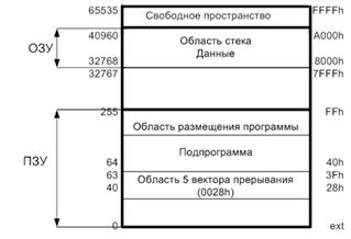 Адреса 0-255 отведенены под ПЗУ. По адресу 0h в ПЗУ размещена 1 команда JMP START. Диапозон по адресу 40 записана команда вызова подпрограммы PRER.