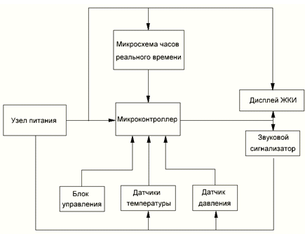 Разрабатываемое устройство представляет собой часы на микроконтроллере, выполняющие также функцию термометра и барометра. В предлагаемом устройстве организован отсчет текущего времени, дня недели, числа и месяца, причем автоматически учитывается, что февраль в високосном году на один день длиннее. Резервное питание от литиевой батареи исключает потерю информации о времени при отключении сетевого питания. Технические характеристики этого прибора соответствуют параметрам примененной в нем микросхемы часов реального времени (RTC - real time clock) PCF8583. Управление производится с помощью шести кнопок и двух выключателей. Предусмотрены сервисные функции для установки точного времени, выдержки времени таймером и момента срабатывания будильника. Показания об атмосферном давлении поступают с аналогового датчика давления МРХ4115: измеряется текущее значение атмосферного давления и его изменение в течение суток с выводом на индикатор соответствующей информации. Температура измеряется двумя цифровыми датчиками температуры DS1621, расположенными в разных местах. Все данные выводятся на однострочный 16-символьным дисплей ЖКИ, который снабжен отключаемой подсветкой.