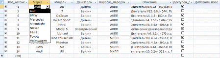 создано поле через «мастер подстановок» со списком марок автомобилей (который