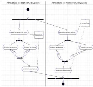 Составим модель движения автомобиля по перекрестку. Для этого будем использовать UML-диаграмму.- язык графического описания для объектного моделирования в области разработки программного обеспечения. На рис. 10 изображена диаграмма UML движения автомобиля.