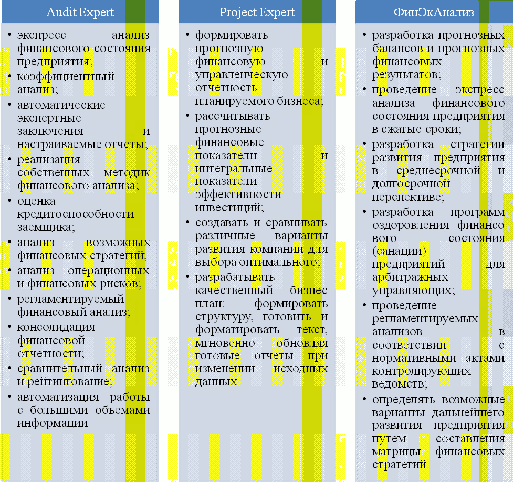 . AuditExpert - аналитическая система диагностики, оценки и мониторинга финансового состояния одного или группы предприятий на основе данных финансовой и управленческой, в том числе консолидированной отчетности. Данная программа ориентирована на финансово-экономические службы крупных компаний, банки и аудиторские фирмы, государственные органы, контролирующие финансовое состояние подведомственных организаций.