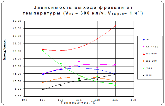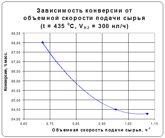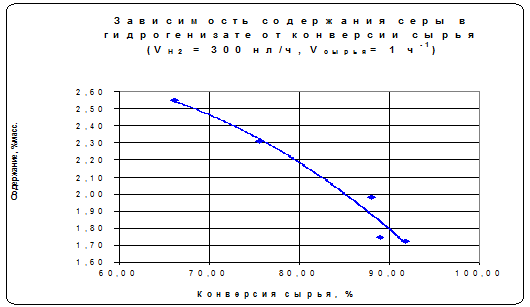 Вывод. Таким образом, исследования показали, что введение в сырье прекурсора, содержащего каталитический компонент, существенно улучшает работу пилотной установки: снижает коксообразование и повышает продолжительность непрерывной работы установки. Добавка прекурсора в сырье способствует повышению конверсии и выхода легких и средних дистиллятов. Повышение конверсии приводит к снижению плотности и вязкости гидрогенизата, а также увеличению степени обессеривания продуктов реакции.