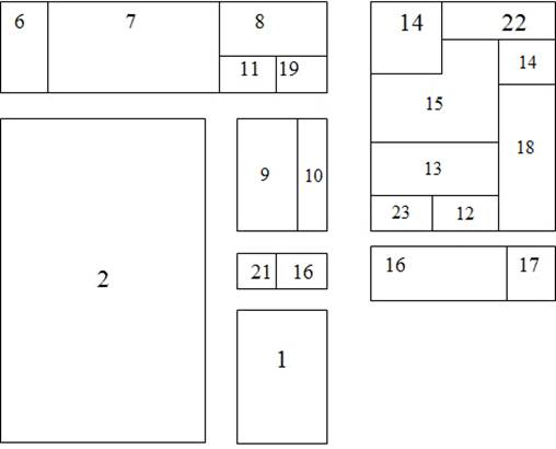 - вестибюль с гардеробом и санузлами; 2 - обеденный зал;6 - холодный цех и помещение для резки хлеба; 7 - горячий цех; 8 - цех мучных изделий; 9 - моечная столовой посуды;10 - моечная кухонной посуды; 11 - доготовочный цех; 12 - машинное отделение охлаждаемых камер; 13 - охлаждаемые камеры; 14 - кладовые продуктов; 15 -загрузочная;16 - бытовые помещения; 17 - служебные помещения; 18 - технические помещения;19 - помещение заведующего, производством; 21 - радиоузел;22 - крытая разгрузочная площадка; 23 - помещения персонала