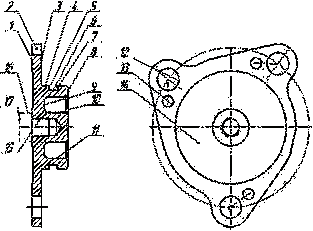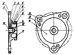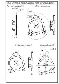 Деталь "Крышка" - вал с фасонным фланцем. На фланце под определёнными углами располагаются 3 отверстия под шпильки диаметром 9 мм, предназначенных для крепления крышки к корпусу. Для устранения самоотвинчивания гаек применяются контровочные шайбы, одна лапка которой отгибается к корпусу гайки а другая в специальные отверстия диаметром 4,5 мм, расположенные на расстоянии 9 мм под углом 55 градусов к осям отверстий. На части фланца с окружностью диаметром 54 мм имеется срез под углом 13 градусов на расстоянии 26,5 мм.