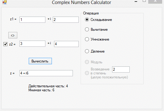 В результате работы была разработана программа, которая осуществляет выполнение операций над комплексными числами на языке программирования С#.