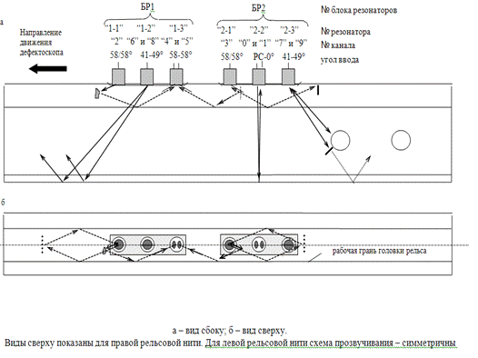 Рисунок 1.1 - Схема прозвучивания рельсов при сплошном контроле
