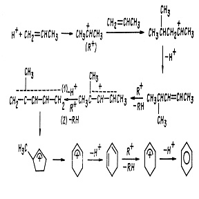 Образование высокомолекулярных ионов карбения описывается посредством реакций конденсации их с олефинами. Процесс будет продолжаться до тех пор, пока размер их молекул не достигнет достаточного для проведения реакции циклизации с образованием ароматических углеводородов и водорода. При добавлении водорода к олефинам получаются парафины.