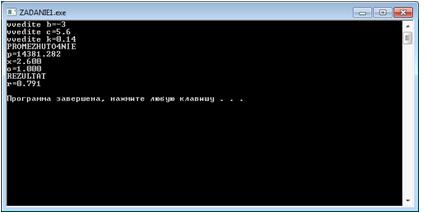Program ZADANIE1;crt;PI=3.14;r,o,p,x,b,c,k:real;;('Введите b=');(b);('Введите c=');(c);('Введите k=');(k);:=14.38E3+exp(1/3*ln(k-lg(ABS(k))));:=b+c;:=cos(2*PI/3*b);:=(o+p)/(x+exp(2*x)+18E3);('Промежуточные');('p=',p:3:3);('х=',p:3:3);('о=',p:3:3);('Результат');('r=',r:3:3);;.