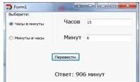 Было необходимо создать программу, которая бы переводила минуты в часы или часы и минуты в минуты. В окне программы пользователь выбирает, что во что переводить и вводит количество часов и минут, потом выводится результат.