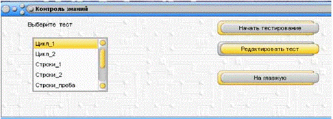 Раздел «Контроль знаний» на первой форме позволяет выбрать тест (в