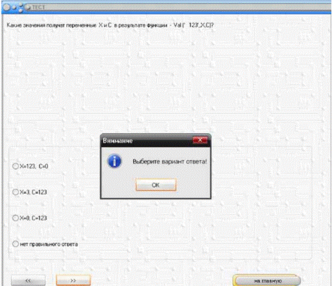 В третьем окне предлагается сам тест, с контролем выбранного ответа (в соответствии с рисунком 5), по окончании теста выдается количество правильных ответов и процент качества, что психологически оправдано.