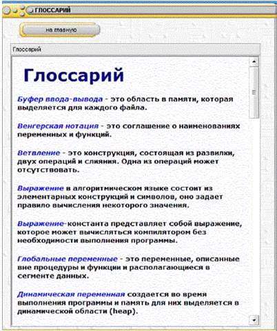 Кроме основных разделов имеются дополнительные: справочник, глоссарий (в