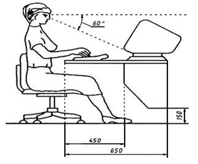 Общие требования рабочее место с дисплеем должно обеспечивать оператору возможность удобного выполнения работ в положении сидя и не создавать перегрузки костно-мышечной системы. основными элементами рабочего места оператора являются: рабочий стол, рабочий стул (кресло), дисплей, клавиатура. Требования к рабочему столу конструкция рабочего стола должна обеспечивать возможность размещения на рабочей поверхности необходимого комплекта оборудования и документов с учетом характера выполняемой работы. рабочие столы по конструктивному исполнению подразделяют на регулируемые и нерегулируемые по изменению высоты рабочей поверхности. Регулируемая высота рабочей поверхности стола должна изменяться в пределах от 680 до 800 мм. Механизмы для регулирования высоты рабочей поверхности стола должны быть легко досягаемыми в положении сидя, иметь легкость управления и надежную фиксацию. Высота рабочей поверхности стола при нерегулируемой высоте должна составлять 725 мм. размеры рабочей поверхности стола должны быть: глубина - не менее 600(800) мм, ширина - не менее 1200(1600) мм. рабочий стол должен иметь пространство для ног высотой не менее 600 мм, шириной - не менее 500 мм, глубиной на уровне колен - не менее 450 мм и на уровне вытянутых ног - не мене 650 мм. рабочая поверхность стола не должна иметь острых углов и краев. Покрытие рабочей поверхности стола должно быть из диффузно отражающего материала с коэффициентом отражения 0,45-0,50. Требования к рабочему стулу рабочий стул (кресло) должен обеспечивать поддержание физиологически рациональной рабочей позы оператора в процессе трудовой деятельности, создавать условия для изменения позы с целью снижения статического напряжения мышц шейно-плечевой области и спины, а также для исключения нарушения циркуляции крови в нижних конечностях. рабочий стул должен быть подъемно-поворотным и регулируемым по высоте и углам наклона сиденья и спинки, а также расстоянию спинки от переднего края сиденья. В целях снижения статического напряжения мышц рук следует использовать стационарные или съемные подлокотники, регулирующиеся по высоте над сиденьем и внутреннему расстоянию между подлокотниками. Регулирование каждого положения должно быть независимым, легко осуществимым и иметь надежную фиксацию. поверхность сиденья должна иметь ширину и глубину не менее 400 мм. Должна быть предусмотрена возможность изменения угла наклона поверхности сиденья от 15° вперед до 5° назад. Высота поверхности сиденья должна регулироваться в пределах от 400 до 550 мм. опорная поверхность спинки стула (кресла) должна иметь высоту (300±20) мм, ширину не менее 380 мм и радиус кривизны в горизонтальной плоскости 400 мм. Угол наклона спинки в вертикальной плоскости должен регулироваться в пределах 0°±30° от вертикального положения. подлокотники должны быть длиной не менее 250 мм, шириной - 50-70 мм, иметь возможность регулирования по высоте над сиденьем в пределах (230±30) мм и регулирования внутреннего расстояния между подлокотниками в пределах от 350 до 500 мм. Требование к дисплею дисплей на рабочем месте оператора должен располагаться так, чтобы изображение в любой его части было различимо без необходимости поднять или опустить голову. дисплей на рабочем месте должен быть установлен ниже уровня глаз оператора. Угол наблюдения экрана оператором отно
