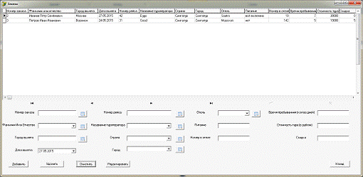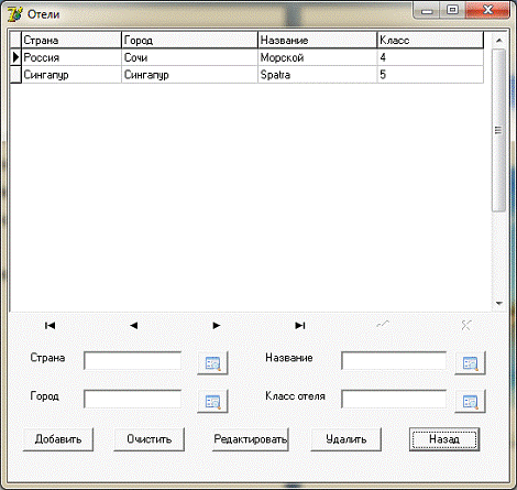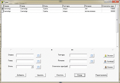 - ввод и редактирование информации о существующих турах, их стоимости, типах питания;