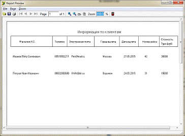 Кнопка «Вывести отчёт Информация о клиентах» предназначена для просмотра