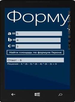 В главном меню при выборе кнопки «Формула Герона» мы переходим к непосредственному решению задачи (вводу данных, получению решения).