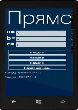 При выборе из главного меню кнопки «Прямоугольный треугольник» пользователь переходит к решению задачи по нахождению площади прямоугольного треугольника.
