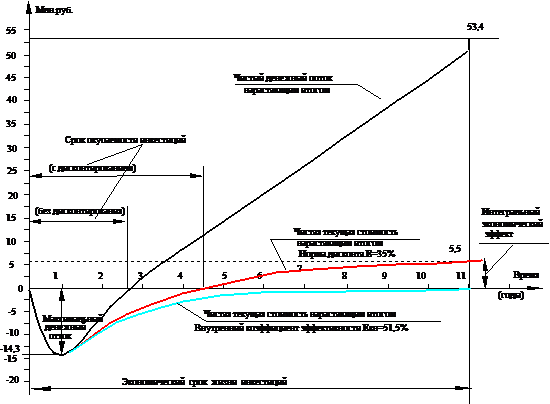 Внутренний коэффициент эффективности Евн=0,515 больше принятой при расчете нормы дисконта (Е=0,35), что позволяет выплату дивидендов учредителям в размере 30% годовых и обеспечивает превышение над нормой дисконта в 1,47 раза для дополнительной компенсации возможных рисков.