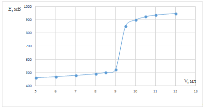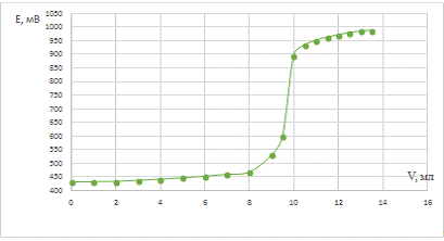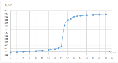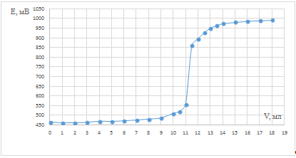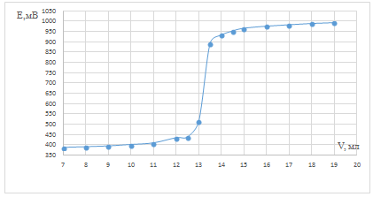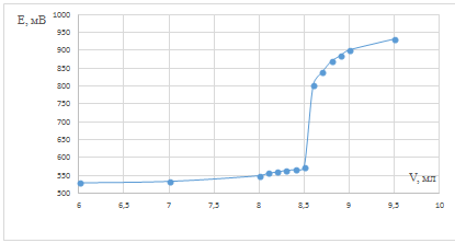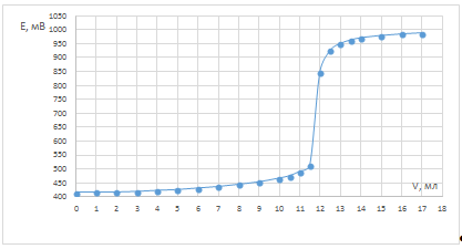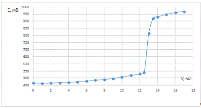 Строили графики зависимости потенциала от объёма титранта. Для определения