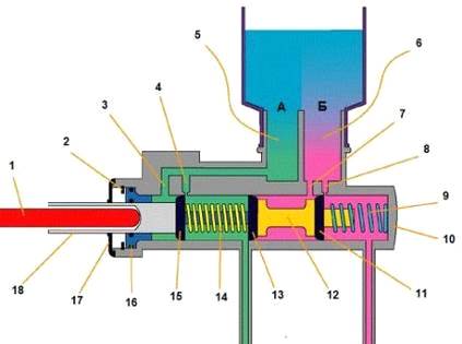 манжета; 16 - наружная манжета; 17 - пыльник; 18 - первый поршень.